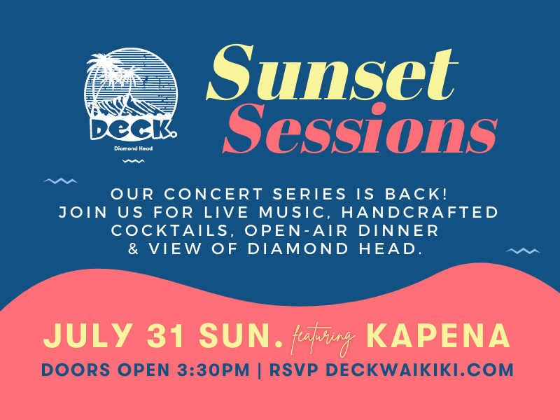 Sunset Sessions concert series is back on Deck! We are kicking off its return on July 31 with Kapena, considered one of Hawaiʻi’s premier island bands, mixing reggae and pop with traditional island music. Join us for an evening of great music, food, craft cocktails, and breathtaking views of Diamond Head! Learn more and book a table from our website.